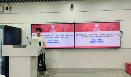 李学恒同学则为大家带来了“FG-YOLO:一种改进的 YOLOv8 实时火灾烟雾检测算法”的介绍。FG-YOLO 算法的核心在于其独特的结构设计。该算法采用了 FSCNet 作为主干网络,并集成了 GScELAN 模块,从而显著提升了特征提取能力。FSCNet 通过利用高频小波系数特征来增强空间特征,有效缓解了因最大池化下采样导致的高频信息丢失问题,保留了更全面的小目标信息。而 GScELAN 模块则进一步优化了特征提取过程,使得 FG-YOLO 在处理复杂场景时能够更精准地识别火焰和烟雾的位置与数量。