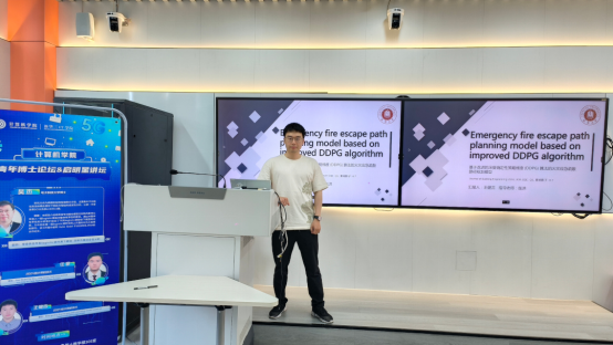 王健吉同学则以“Emergency fire escape path planning model based on improved DDPG algorithm“为题,向大家介绍了一种使用深度强化学习对火灾环境下人群疏散的建模。该模型为解决传统静态疏散方案无法适应动态火灾场景的问题,使用了一种改进的DDPG算法(I-DDPG)来进行路径规划。该算法首先使用白鲸优化(BWO)算法自动优化超参数,并以随机网络蒸馏(RND)和事后经验回放(HER)进一步改进传统DDPG算法的表现。模型训练时还使用OU噪声来增加稳定性。最后实验表明该模型能够为建筑物内任意位置的受困者生成动态疏散路径,且在不同火灾场景中均表现出强适应性。