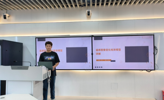 王翔同学介绍了 “Dual-Task Constrained Siamese Convolutional Network for Building Change Detection” 论文,该文提出双任务约束深度孪生卷积网络(DTCDSCN)模型,用于遥感图像建筑变化检测。模型含一个变化检测子网络和两个语义分割子网络,在同一框架下同步进行变化检测与语义分割,聚焦建筑对象级特征,提升特征辨识度,生成更完整变化检测图。同时引入双注意力模块(DAM),利用通道与空间位置相互依赖关系增强特征表达,还改进局部损失函数应对样本不平衡问题,实验显示该方法在精确度、召回率、F1 分数和交并比等指标上达最先进水平。