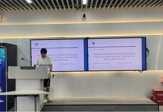 然后,张峻松同学介绍了“Weakly Supervised Contrastive Adversarial Training for Learning Robust Features form Semi-supervised Data”。现有对抗性训练方法常受不完全扰动影响,导致稳健特征学习不佳。文中提出了弱监督对比对抗训练(WSCAT)方法,其基于信息论,通过完整生成对抗性示例破坏非稳健特征和标签的相关性,实现完全扰动以提升稳健特征学习效果。经广泛理论分析和实验验证,WSCAT 方法在多个基准测试中均展现出优越性,为半监督数据鲁棒特征学习提供了新思路,推动了相关领域的研究进展。