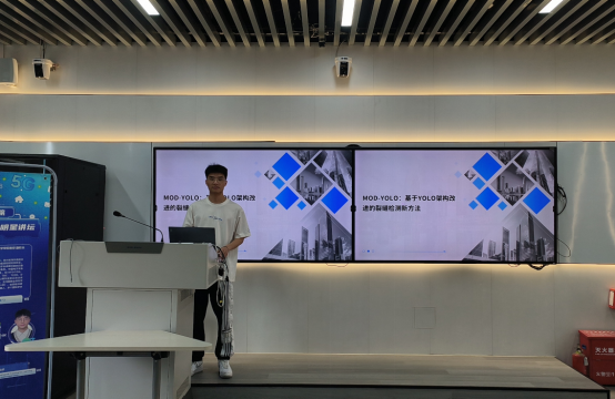 讲坛开始,由吴闻辰同学向大家介绍“A Universal Structure of YOLO Series Small Object Detection Models”,文章主要聚焦于民用基础设施裂缝检测的重要性,鉴于传统 YOLO 系列算法存在的信道信息丢失和感受野缺失问题,设计了保持原始维度 YOLO(MOD-YOLO)算法,涵盖多种即插即用的改进方案,最后构建了 Maintaining the Original information-Depth Separable Network(MODSNet)及 Maintaining the Original Dimension Light-Head。实验表明,该算法在裂纹数据集上较 YOLOX 算法准确率大幅提高,且在多个数据集上展现出良好泛化性,还提出了用于裂纹检测的整车部署方案,为车辆行驶时检测裂纹提供支持。