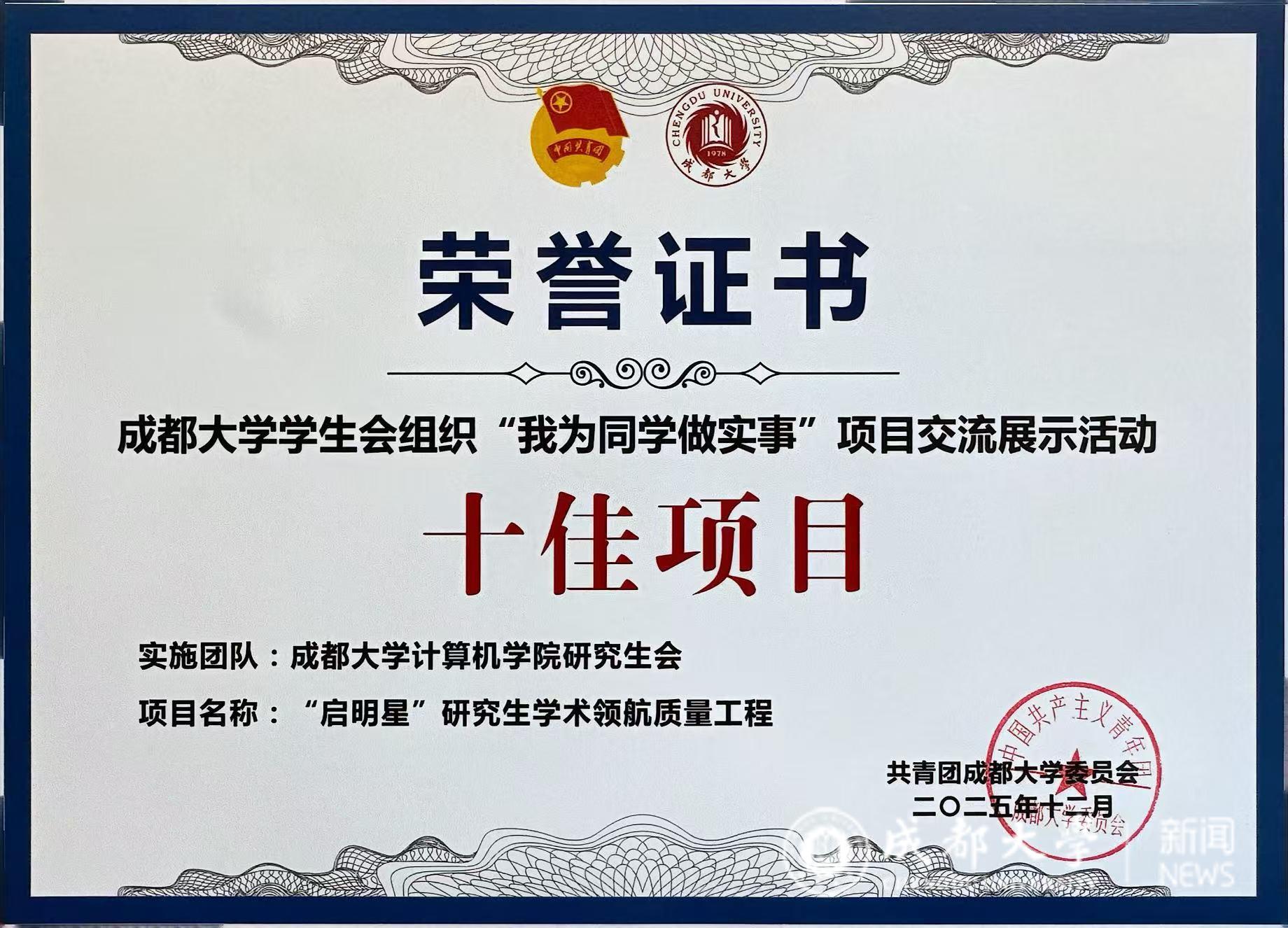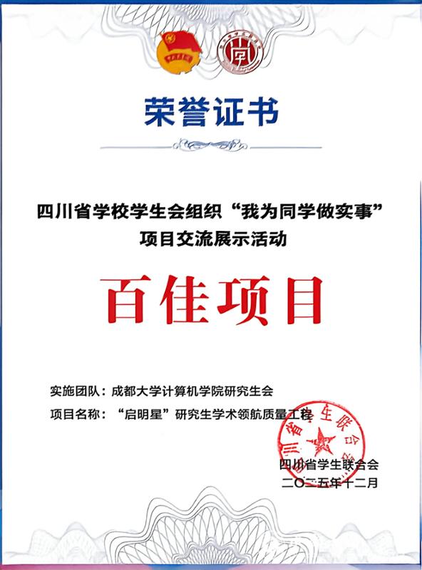 研究生会“启明星”研究生学术领航质量工程荣获2025年四川省学校学生会组织“我为同学做实事”百佳项目。