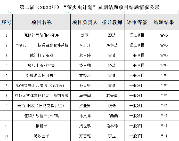 根据《Bwin体育官网 “萤火虫计划”管理办法》和《Bwin体育 关于开展2022年萤火虫计划延期结题项目验收工作的通知》,经项目结题报告提交、专家评审等环节,现对第二届(2022年)“萤火虫计划”延期项目结题结果进行公示。