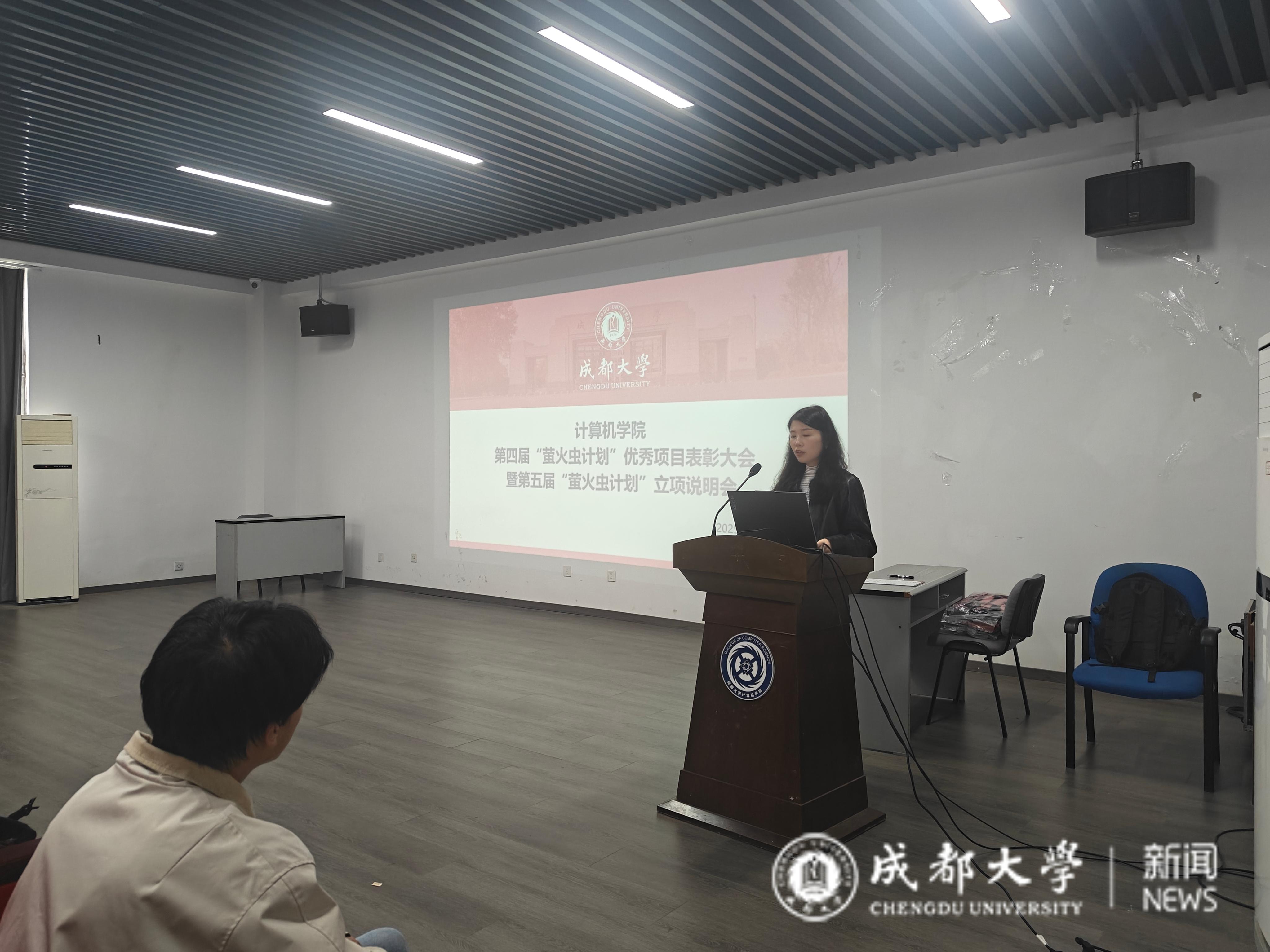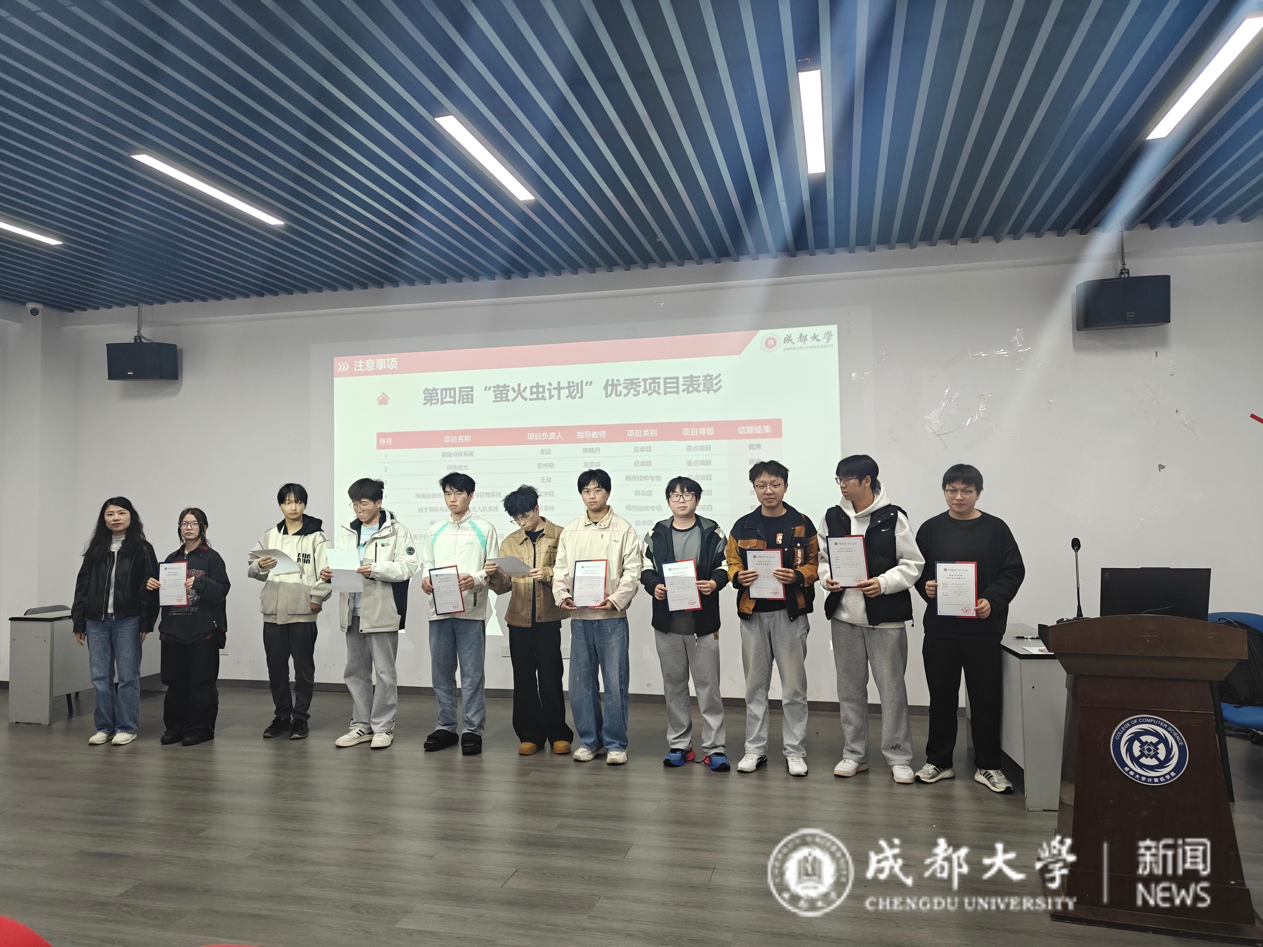 人才培养体系的重要组成部分,始终坚持以项目为牵引,以专业为根基,推动学生在实践中深化理论认知,在创新中锤炼综合能力。面对新一届立项的63支团队,他勉励同学们要勇于突破思维边界,敢于探索未知领域,在实干中成就卓越。之后,龚硕系统介绍了“萤火虫计划”的项目实施流程与管理规范,并回顾了第四届计划的整体执行情况,且指出本届多个项目展现出鲜明的创新特色与扎实的应用价值。在颁奖环节,龚硕老师为第四届“萤火虫计划”优秀团队颁发了优秀结题证书。