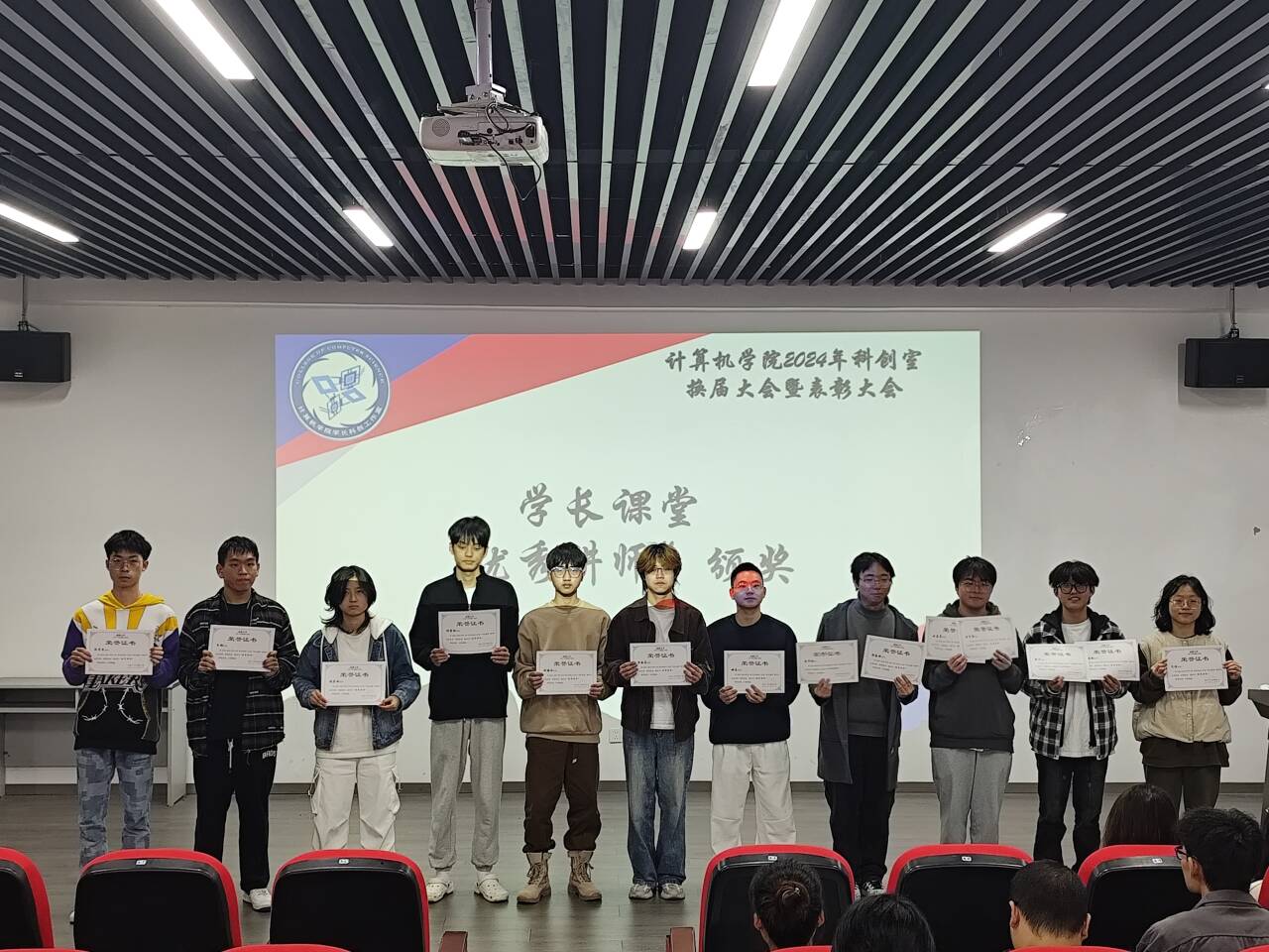 接下来,大会进入了表彰环节。首先,由龚硕老师为上一届各方向主任颁发聘书和奖品,以表彰他们在过去一年中的杰出贡献。随后,上一届办公室主任刘梦、前端方向主任姚亮上台讲话,他们分享了自己在科创室的经历和学习心得,以及在实习期间的感悟和对学弟学妹的寄语,鼓励大家不断追求卓越。