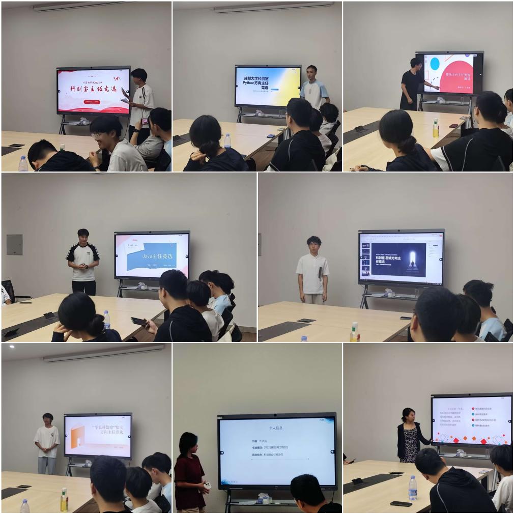 龚硕对上一任科创室学生干部在任职期间的辛勤付出、认真负责表示了认可和感谢,同时对本次学生干部换届提出了新的要求。随后,候选人依次发表竞选演说,通过PPT展示、案例分享等形式,全方位地展示自身优势和对未来工作的思考以及规划。他们的竞选内容详实且条理清晰,从技术创新到团队建设,从项目规划到人才培养,既彰显了深厚的专业素养,又饱含着对工作室的深情厚谊,为工作室未来发展描绘出一幅幅充满希望的蓝图。