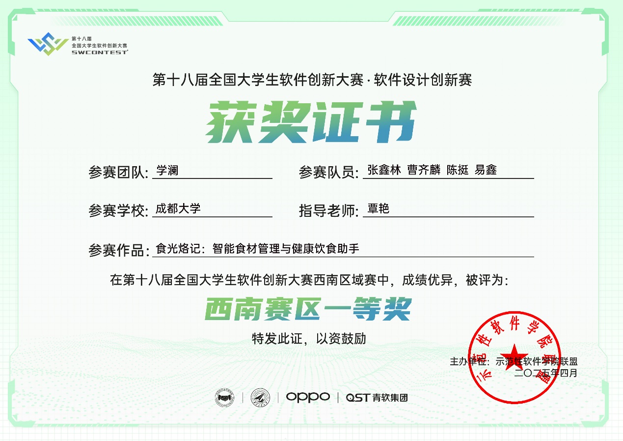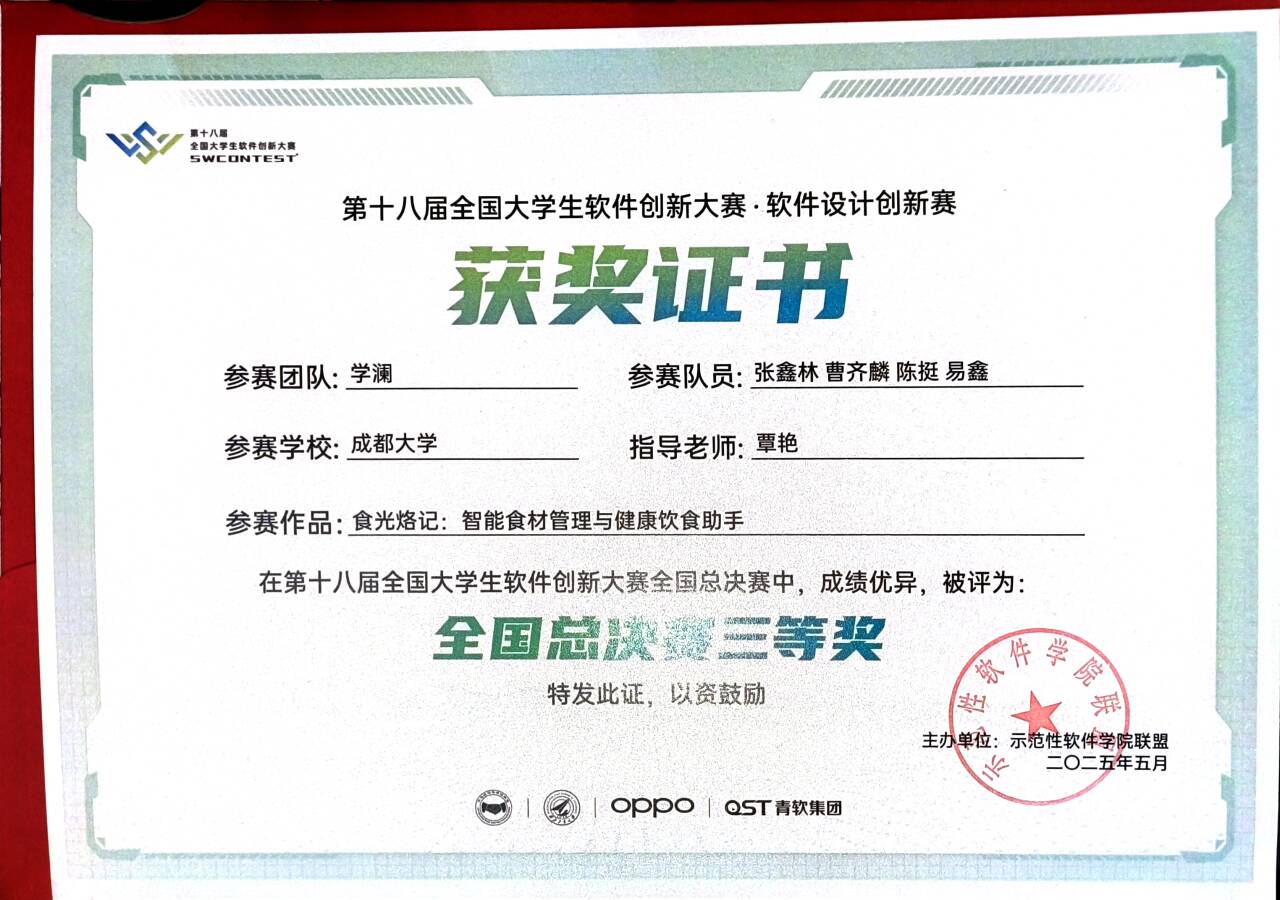 参赛团队“学澜”(队员:张鑫林、曹齐麟、陈挺、易鑫)凭借作品《食光烙记:智能食材管理与健康饮食助手》以西南赛区一等奖的佳绩晋级全国赛。经过全国赛复赛的专家评审,“学澜”团队凭借扎实的技术实力与创新设计最终从全国114支队伍中脱颖而出,跻身获奖行列,荣获全国赛三等奖。指导老师覃艳全程指导团队备赛,助力团队实现区域与全国赛的双重突破。