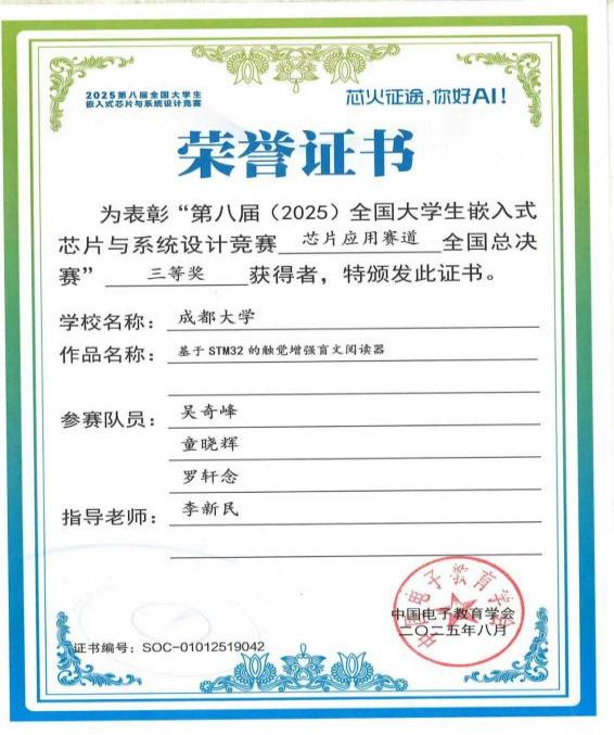 学子吴奇峰(物联23-1)、童晓辉(物联23-1)、罗轩念(物联23-1)组成的团队,在李新民老师指导下,凭借自主研发作品《基于STM32的触觉增强盲文阅读器》从激烈竞争中脱颖而出,荣获全国总决赛三等奖,为我校在硬件开发技术竞赛领域再添荣誉。