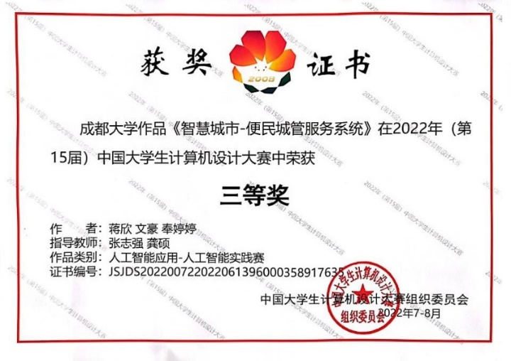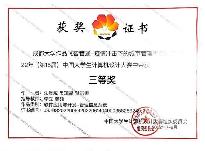 的张志强、李立、龚硕老师指导的学生团队参赛作品《智慧城市-便民城管服务系统》(人工智能应用类别)和《智管通-疫情冲击下的城市管理平台》(软件应用与开发类别)荣获全国三等奖。