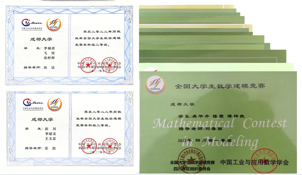 施达、杨洪、赵千、刘春燕及高研院董浩老师指导的32支参赛队伍通过不懈努力,最终18支参赛队伍获奖,其中获全国二等奖2项,四川赛区一等奖2项、二等奖6项,三等奖8项,参赛获奖率达56.25%,获奖项数及获奖率均创我校历史新高。