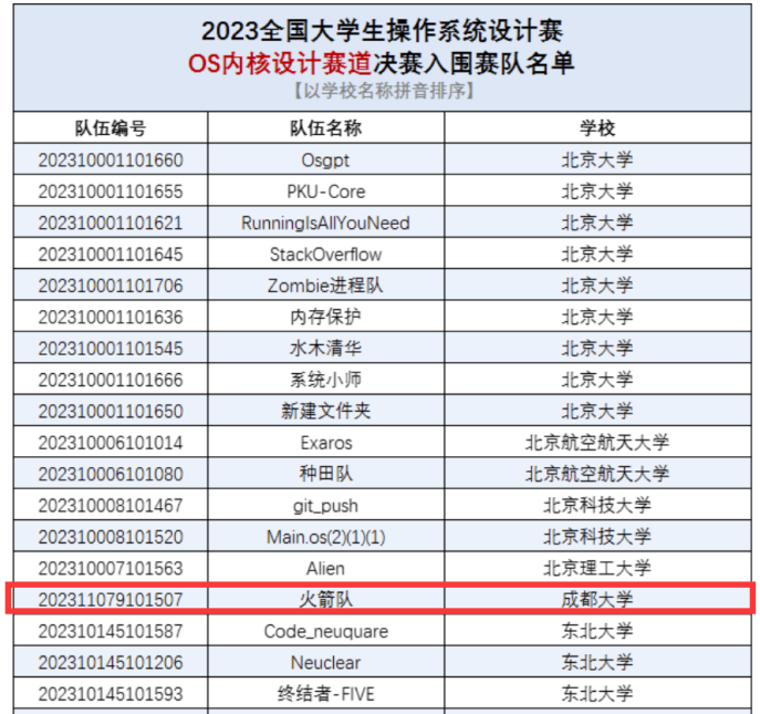 近日,2023全国大学生操作系统设计赛组委会正式公布了决赛入围赛队名单。经过激烈的初赛角逐和精细的技术方案评审,共有55支队伍在内核设计赛道上脱颖而出,成功晋级决赛;同时,在功能挑战赛道上,也有135支队伍获得了决赛资格。