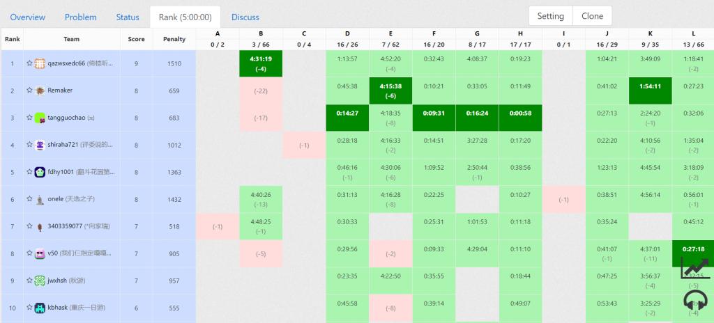 最后经过5个小时的漫长比赛,最后选出排名第一的队伍参加ACM-ICPC亚洲区预赛(杭州)现场赛,选出排名前八的男队和排名第一的女队参加重庆市第十一届大学生程序设计大赛现场赛。具体名单公示如下: