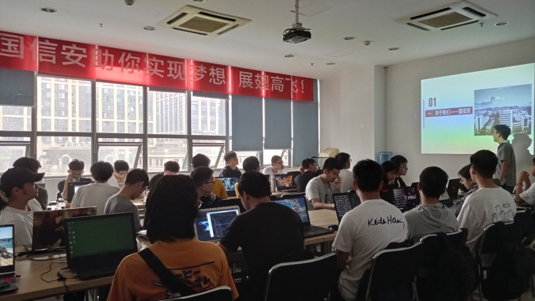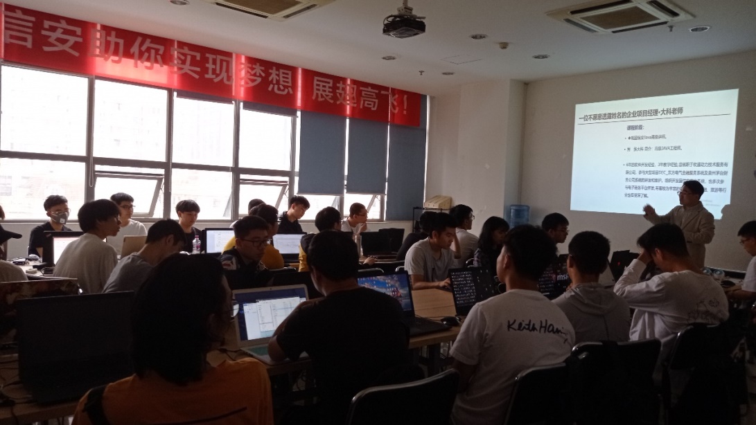 2021年5月14日上午9时开始集中实习,由国信安公司本次校企合作项目经理龚鑫对各位同学的到来表示了热烈欢迎,并对此次生产实习进行了隆重的开班仪式。开班仪式上龚经理针对现在成都互联网产业发展的前景做了简单介绍,将行业产业发展与个人发展的紧密联系做了深入介绍。鼓励同学们成为当前时代背景下最紧缺的互联网人才。简短的开班仪式后,本次生产实习的技术经理张大科,针对此次生产实习的技术内容和项目目标作出阐述和要求,将整个项目流程完整与同学们梳理一遍,让学生们在清晰的学习思路上开展生产实习。项目分组阶段,为模拟企业真实开发场景,将各个班级学生随机组合为多个开发小组。组建一次简短的团队展示活动,增强团队开发荣誉感,熟悉本组开发团队成员。随后正式进入课程阶段,所有学生均全身心投入生产实习。期待本次实习圆满完成!