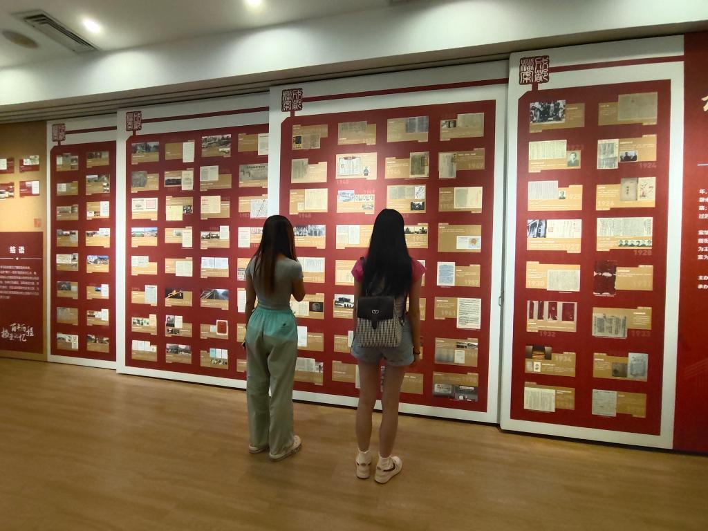在习近平新时代中国特色社会主义思想专题展区,同学们从党的十九大、十九届六中全会提出的“十个明确”“十四个坚持”“十三个方面成就”对习近平新时代中国特色社会主义思想的主要内容进行学习。