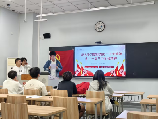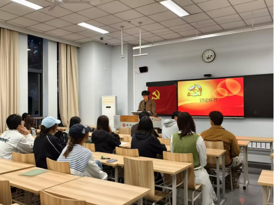 会议开始后,全体起立共唱国际歌,随后主持人向各位拟发展对象介绍了本次讨论会的规则:各小组依次上台进行汇报,汇报结束后由其他组同学进行提问。讨论期间,各位同学积极参与,踊跃发言。其中唐俊杰同学表示:作为新时代青年,要深刻领会党的二十大擘画的宏伟蓝图和党的二十届三中全会部署的改革任务,将国家发展目标与个人专业学习相结合,为推进中国式现代化贡献智慧。