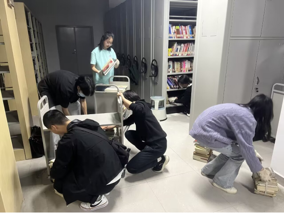 与此同时,下午14:00,二支部同学到达图书馆东2门进行签到。随后席彭坤同学宣布活动正式开始。各位同学按要求分组后,在图书馆管理人员的带领下前往指定地点,了解并熟悉工作流程,开始图书的搬运和整理。
