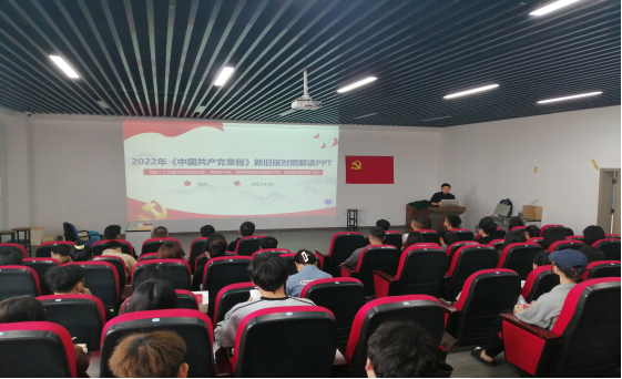 学生党支部书记于10教501室讲“解读新《中国共产党章程》”主题党课。学生党支部全体党员和预备党员到场聆听。