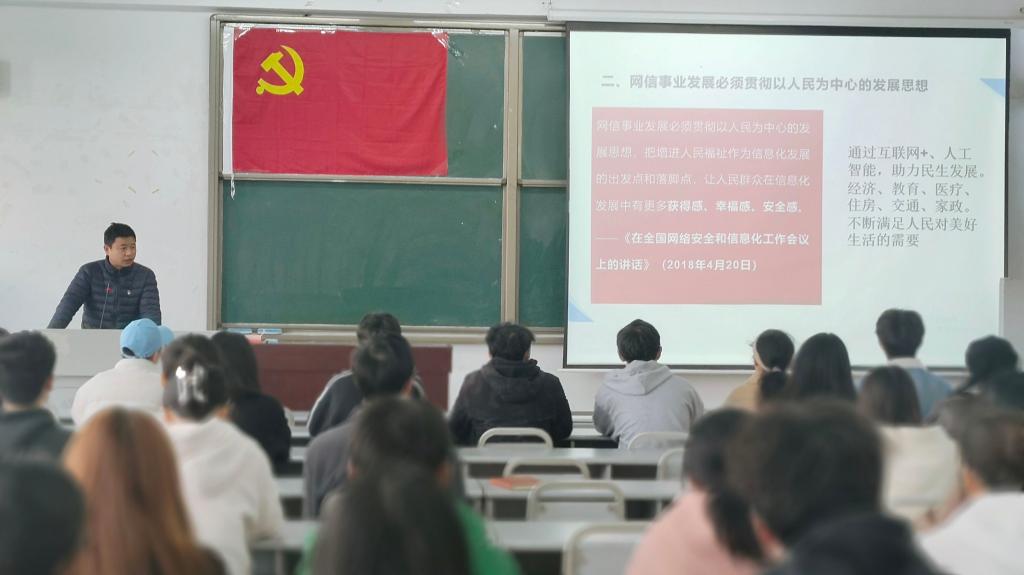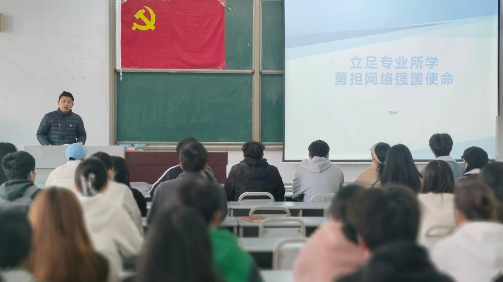 学生党支部书记饶涛于10教201室讲“勇担网络强国使命”党课,学生党支部全体党员、预备党员到场聆听。