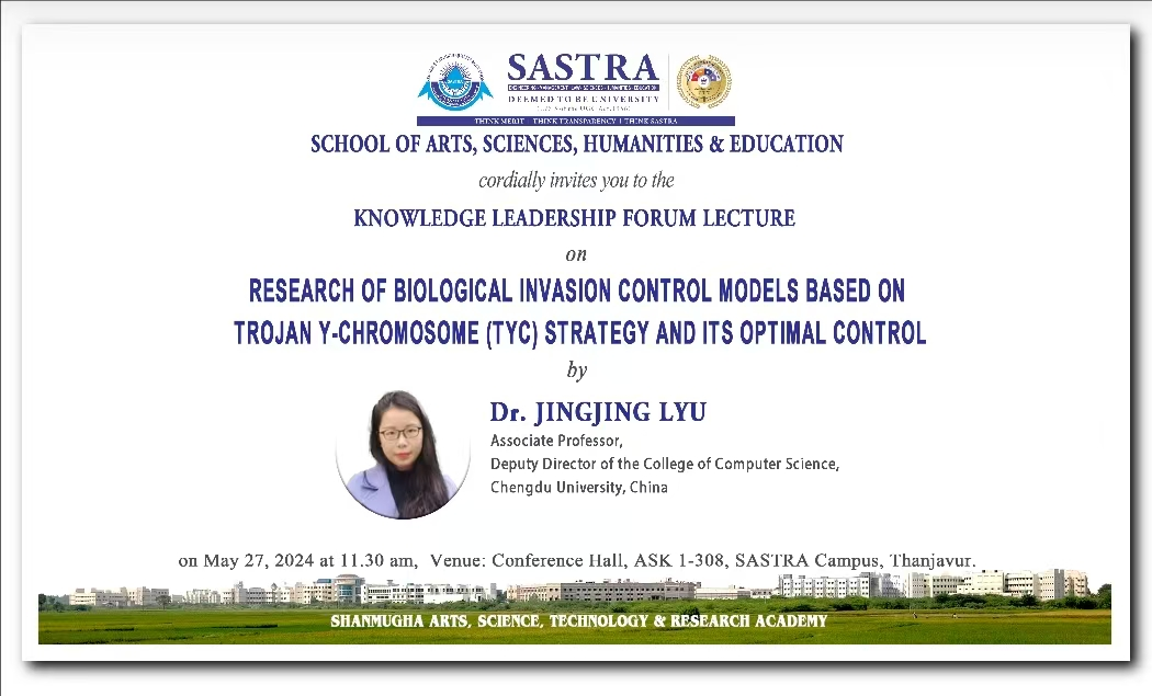 教师刘昶教授及吕晶晶副教授受SASTRA Deemed University邀请参加了一场科技讲座,刘昶教授分享了她关于“解码大脑:利用机器学习进行神经科学研究”的最新研究成果,吕晶晶副教授作了关于“基于特洛伊Y染色体(TYC)策略的生物入侵控制模型及其优化控制研究”的学术报告。