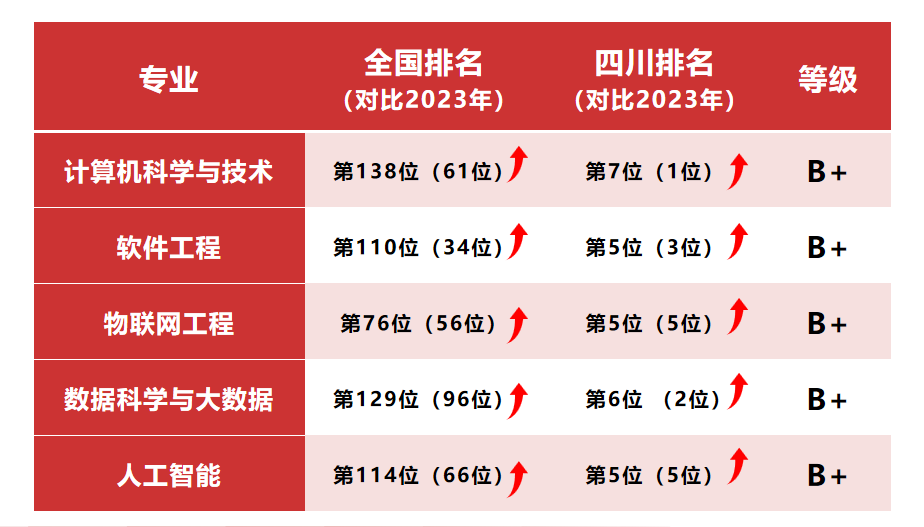 相较2023年的数据,榜单中,计算机科学与技术专业从全国第199位跃升至第138位,省内排名第7位;软件工程专业从全国第144位上升到第110位,省内排名第5位;物联网工程专业全国排名从第132位提升至第76位,省内排名第5位;数据科学与大数据专业全国排名从第225位跃升至第129位,省内排名第6位;人工智能专业全国排名从第180位升至第114位,省内排名第5位。