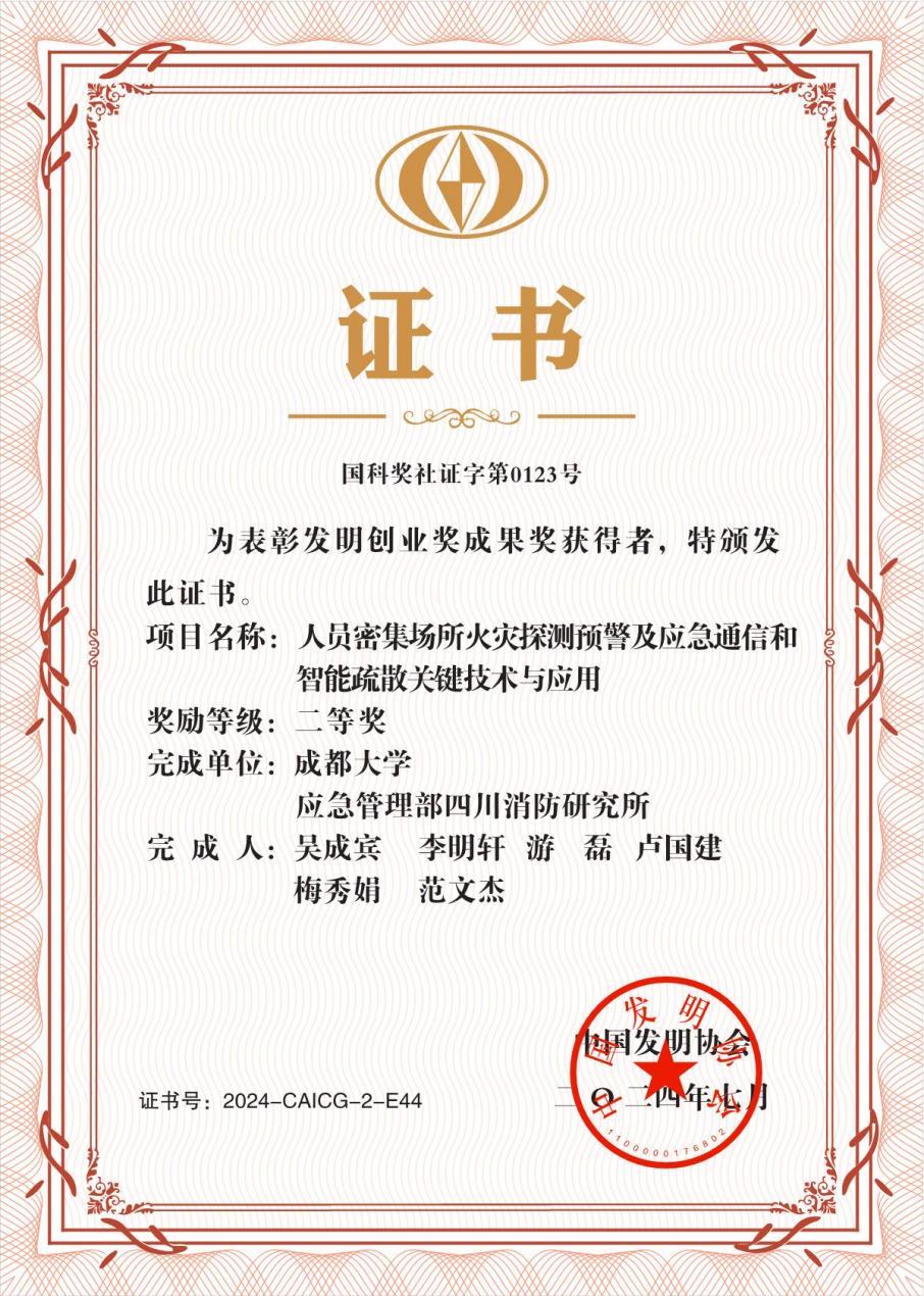 吴成宾教授团队的“人员密集场所火灾探测预警及应急通信和智能疏散关键技术与应用”项目,在中国发明协会主办的评选中脱颖而出,荣获发明创业奖成果奖二等奖。