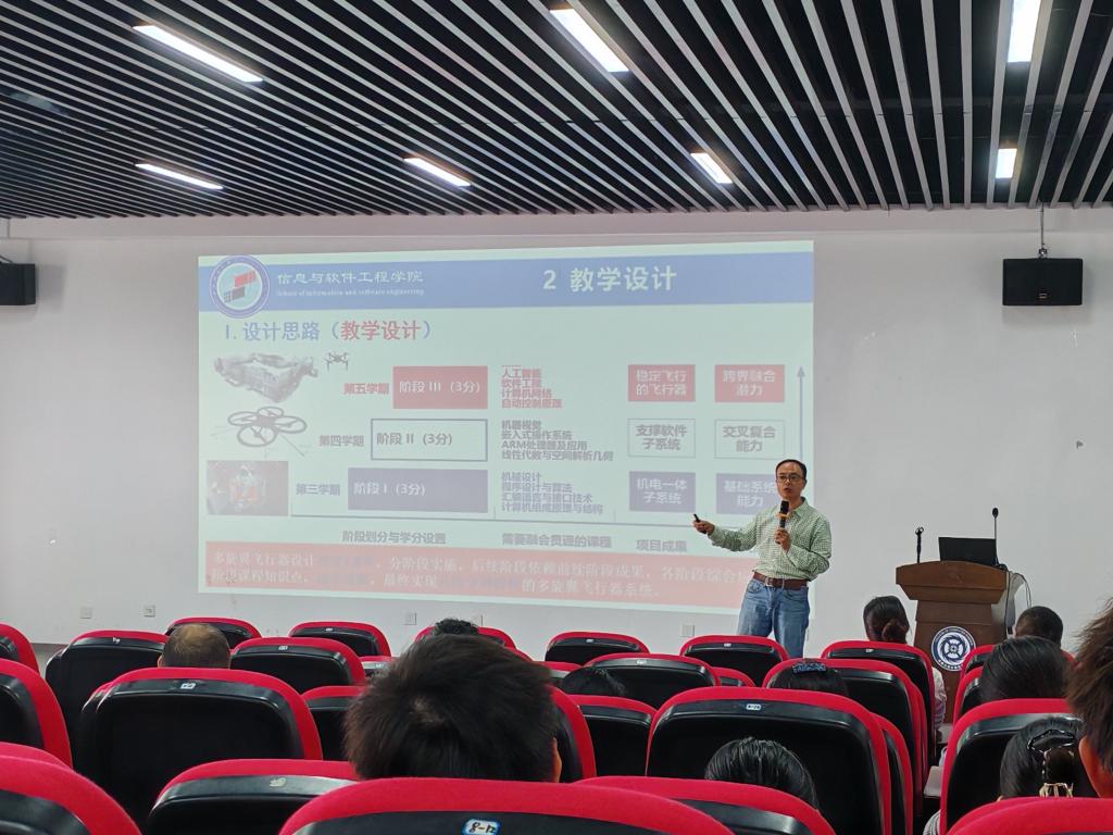 廖勇教授以“志趣驱动的跨学科挑战性项目式教学模式探索”为题,结合自身教学研究经历,围绕课程定位、课程目标、课程教学设计、教学实施、应用情况等四个方面深入解读了项目式教学的核心理念和实践要领。在课程教学设计和教学实施模块中,重点介绍在教学中如何培养学生能力以及项目团队组建、如何用理论指导实践等问题。