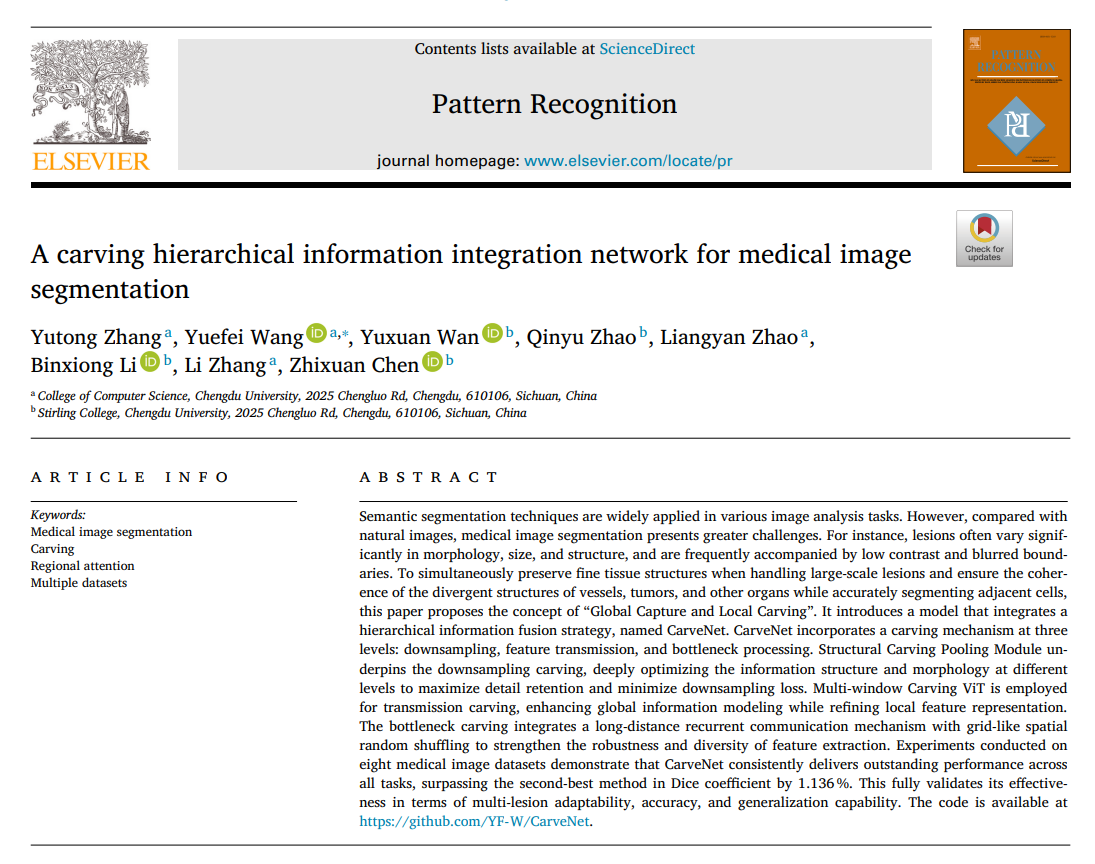 一区,IF=7.6)发表题为“Acarvinghierarchicalinformationintegrationnetworkformedicalimagesegmentation”的学术论文,2022级本科生张羽彤为第一作者,王跃飞副教授为通讯作者,成都大学为第一署名和通讯单位。