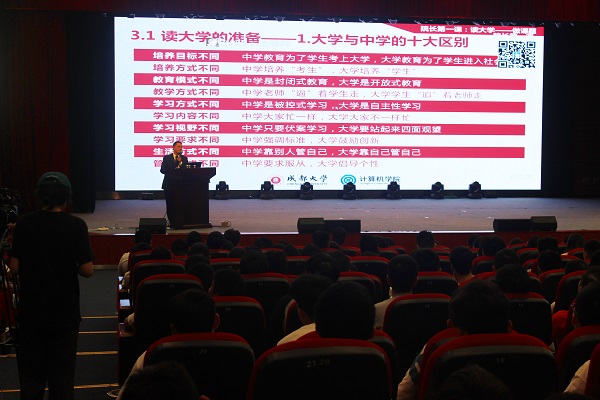 创造的良好条件努力学习;从大学与中学的区别和读大学的准备讲起,详细教授了同学们读好大学的“十大攻略”。现场新生们反响热烈,把会场气氛推向高潮。