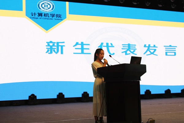 2020级软件工程专业的唐玲玲作为新生代表上台发言,她表示对全新的大学生活充满期待,并表达了要珍惜大学时光不断学习进步的信心和决心。