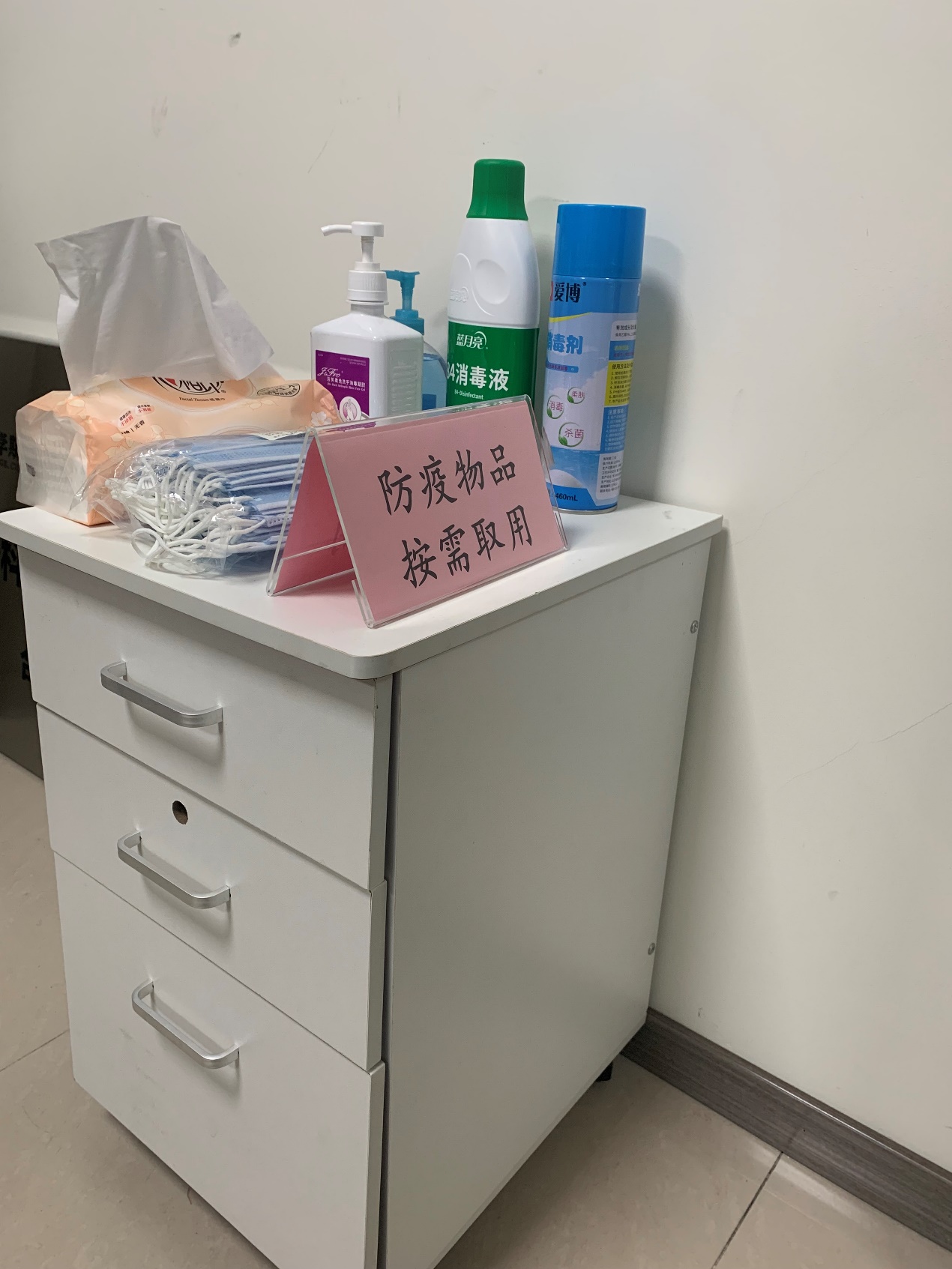 行政办公区设立防疫物资角,及时补充各类防疫物资,供师生按需领用。