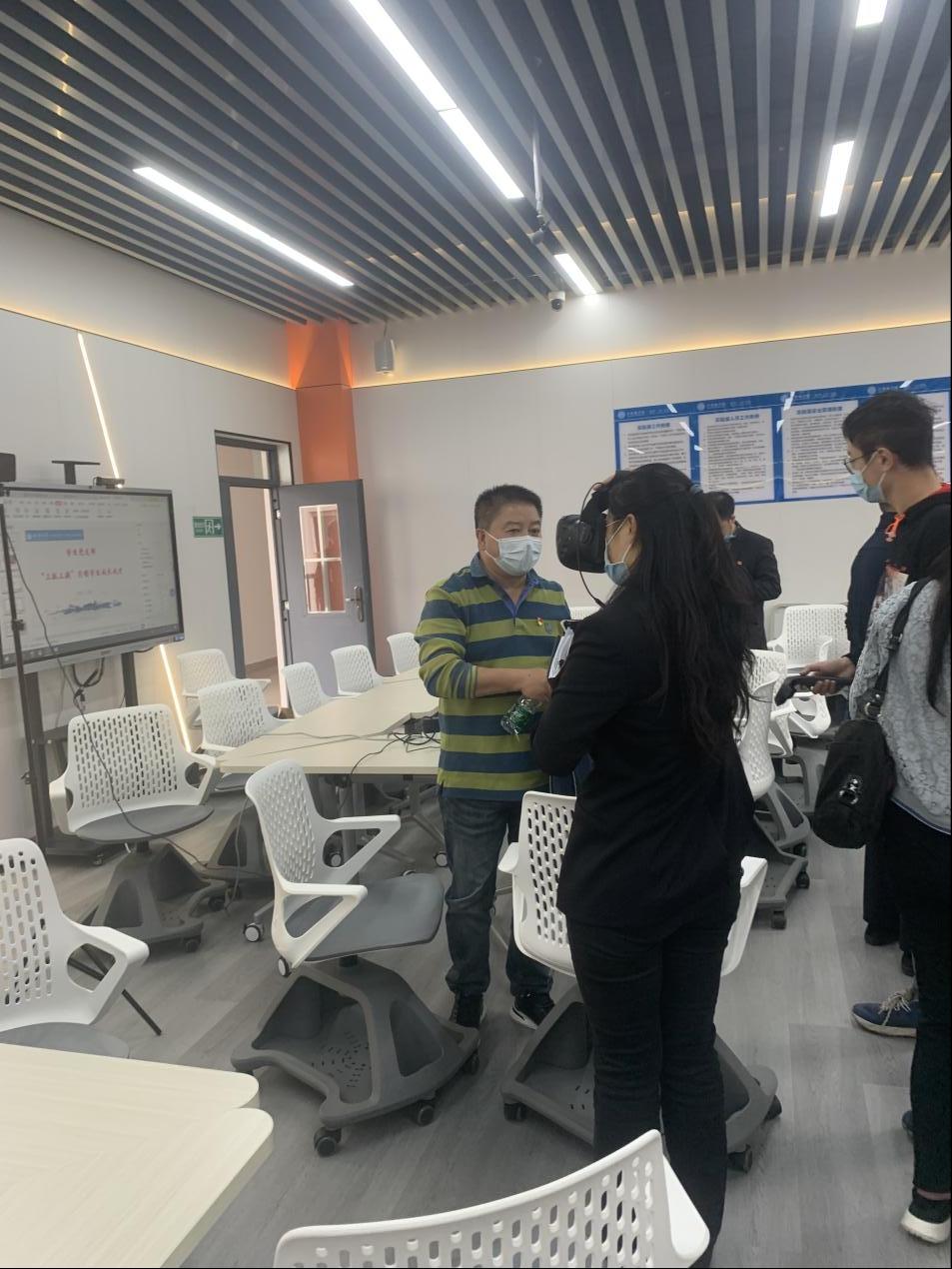 教学+党建思路,向与会老师开展VR虚拟现实技术进行三维建模与漫游互动的“VR参观百年党史”演示,获得了参观一行人员的关注及肯定。