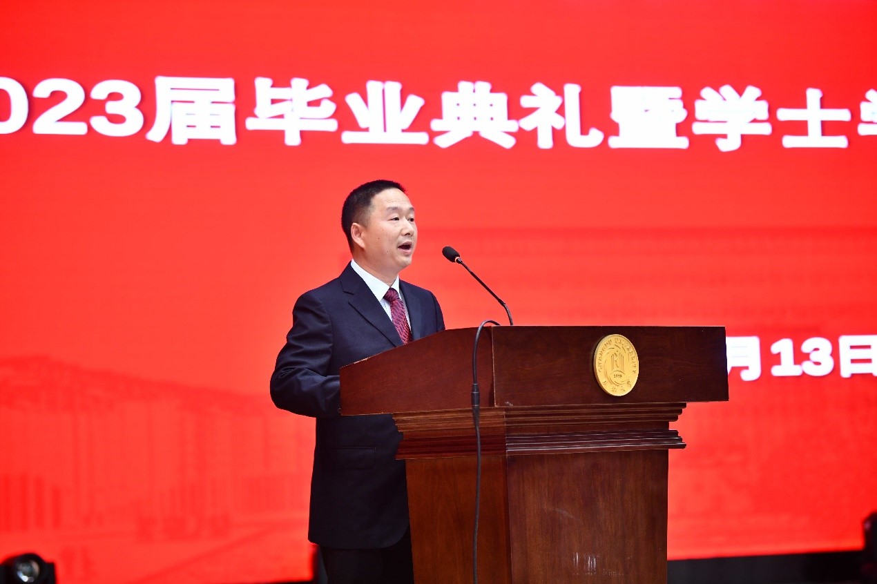 过去几年的发展历程,并对毕业生们的成长和取得的成绩表示由衷的欣慰。他鼓励毕业生怀着感恩之心,勇往直前,积极进取,时刻保持学习的热情和求知的好奇心。他相信,毕业生们将以优秀的素质和扎实的专业知识投身于社会,为祖国的建设和发展做出积极的贡献。最后,他向毕业生们表示最诚挚的祝贺,并勉励他们开启崭新的人生篇章。
