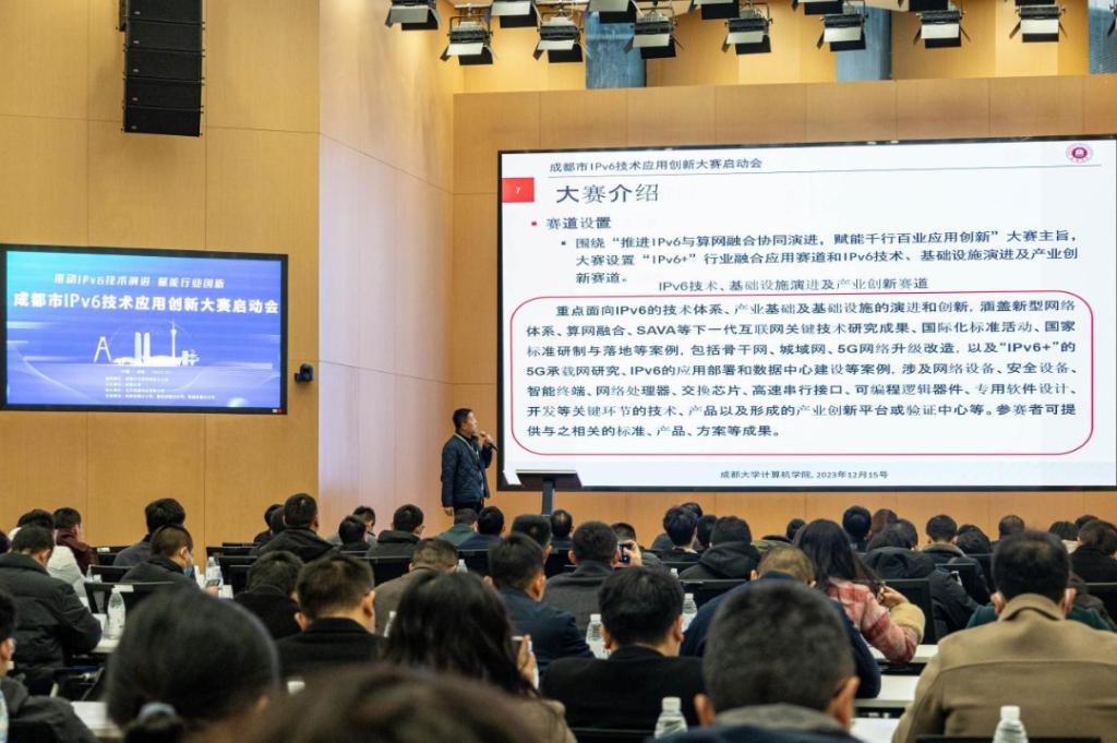 王进副院长对大赛规则进行了解读。本次大赛设置“‘IPv6+’行业融合应用”、“IPv6技术、基础设施演进及产业创新”两大赛道,面向全社会各单位征集相关领域IPv6典型优秀案例和方案,参赛作品要与IPv6技术紧密结合,促进IPv6与政务、教育、媒体、金融、医疗等领域开展规模应用、技术创新以及技术演进。活动征集时间截止于2024年3月底,参赛单位及其团队可以登录“网信成都”微信公众号查阅有关信息,下载“成都市IPv6技术应用创新大赛申报书(模板)”并填报相关材料,按照要求提交大赛项目方案等材料。由组委会组织评审专家组进行初评,并推荐优秀项目参加2024年4月举行的决赛。届时,评审专家组将进行现场评审,根据决赛综合成绩排名产生获奖作品。2024年5月将举办项目颁奖仪式,并对获奖作品进行宣传推介。